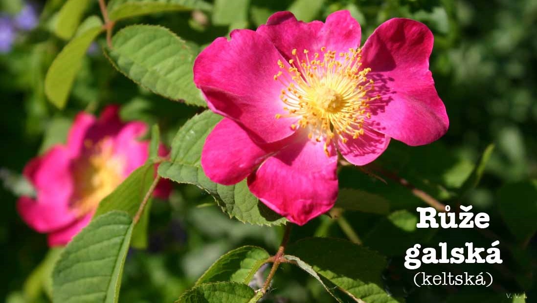 Růže galská (latinsky Rosa gallica) patří do čeledi růžovité (Rosaceae). Říká se jí také Rosa Mundi nebo růže lékárníků. Jedná se o odspodu rozvětvený keř dorůstající výšky až 120 centimetrů. Listy jsou složené, pětičetné, matně zelené a na okrajích pilovité. Silně vonící květy se objevtyí jednou za rok koncem května a v červnu.Jsou poloplné, s okvětními plátky ve dvou řadách, mají sytě růžovou barvu s bílým až světle růžovým žíháním. Střed květu je žlutý s velkým množstvím tyčinek. Plodem je oranžovočervený kulatý šípek.