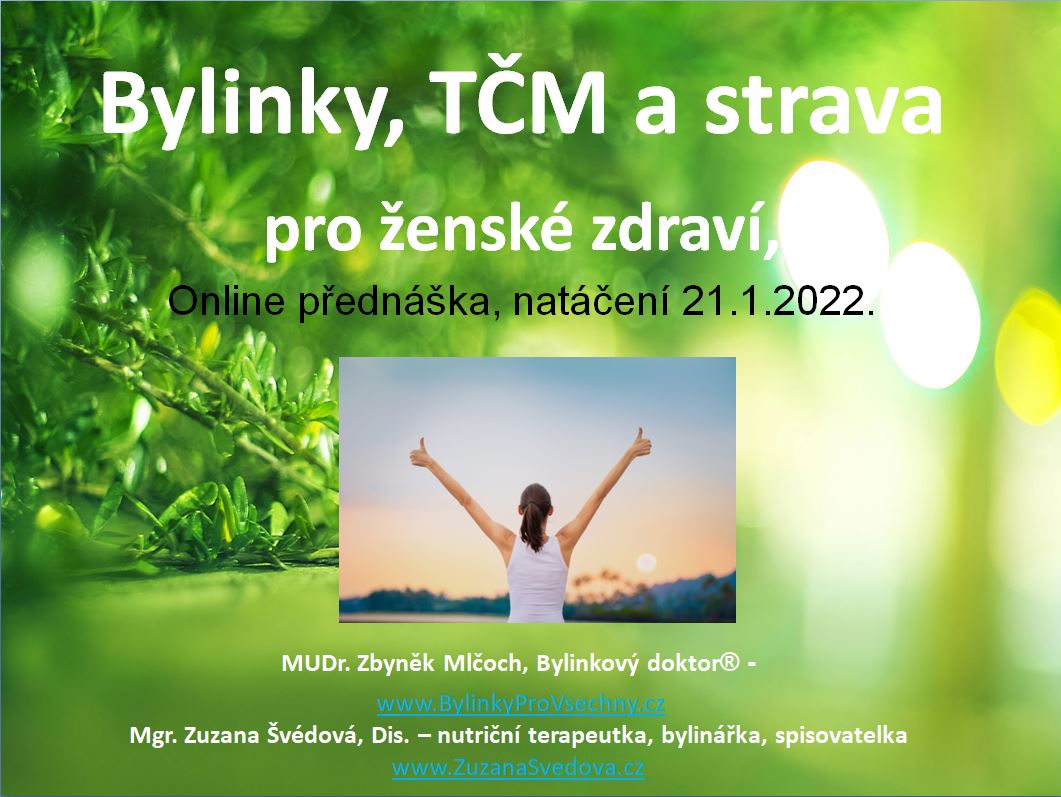 V pátek 21.1.2022 bude od 14 hodin neveřejně natáčena online přednáška na téma ženského zdraví, léčivých rostlin a stravy. Přednáška bude po sestříhání kameramanem ke stažení ZDE. Lektory v přednášce bude MUDr. Zbyněk Mlčoch (lékař, bylinář, teoretik TČM) a Mgr. Zuzana Švédová, Dis. (nutriční terapeutka a bylinářka).