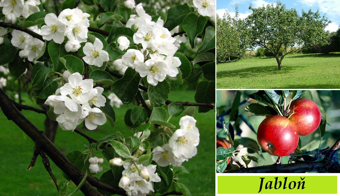 Jabloň planá (lesní), jabloň domácí - latinsky malus silvestris, malus domestica. Podporuje trávení, zlepšuje krevní obraz, posiluje srdce, nervy, krevní oběh. Jabloň je asi 10 metrů vysoký listnatý strom s širokou, kulovitou, hustě větvenou korunou. Listy má střídavé, široce oválné až okrouhle vejčité, drobně pilovité. Na rubu bývají plstnaté.