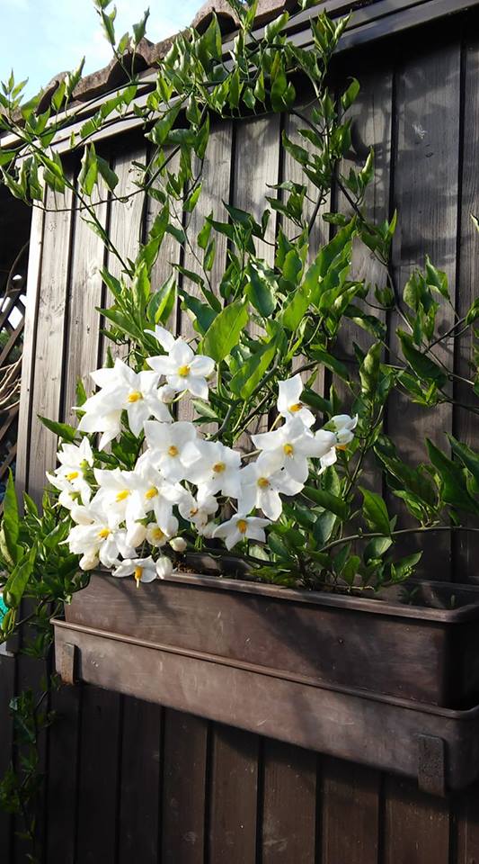 Neznámá popínavá rostlina s bílými květy rostoucí v truhlíku - jméno, název podle fotografie (Jasmín popínavý)