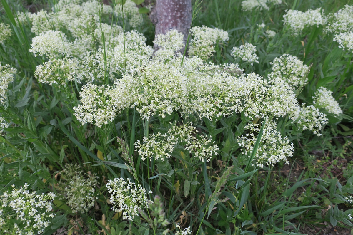 Na páté fotce s bílými květy nyní všude kvetoucí vesnovka jarní (Cardaria draba), na posledním obrázku orlíček (Aquilegia vulgaris).