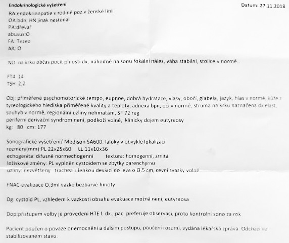 Co se týče ještě té léčby, tak za situace kdy jde o nekomplikovaný uzel tvořící hormony štítné žlázy v nadbytku (tzv. autonomní adenom) a výsledek FNAB je příznivý, je možné místo operace přistoupit k lokálnímu ozáření radioaktivním jódem, tedy tzv. aplikaci terapeutické dávky radiojódu.