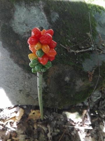 Neznáma přízemní rostlina, bylina, bylinka - tlustý stonek, seskupení červených bobulí (áron italský)