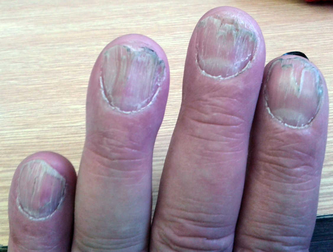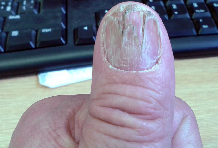 Nehty jsou velmi zanedbané, rozpadají se, jsou vrstvovité. Jde zřejmě o chronickou a docela těžkou onychomykózu (nejsem ale dermatovenerolog, takže zvažte návštěvu kožaře, který Vám udělá přesnou diagnostiku).