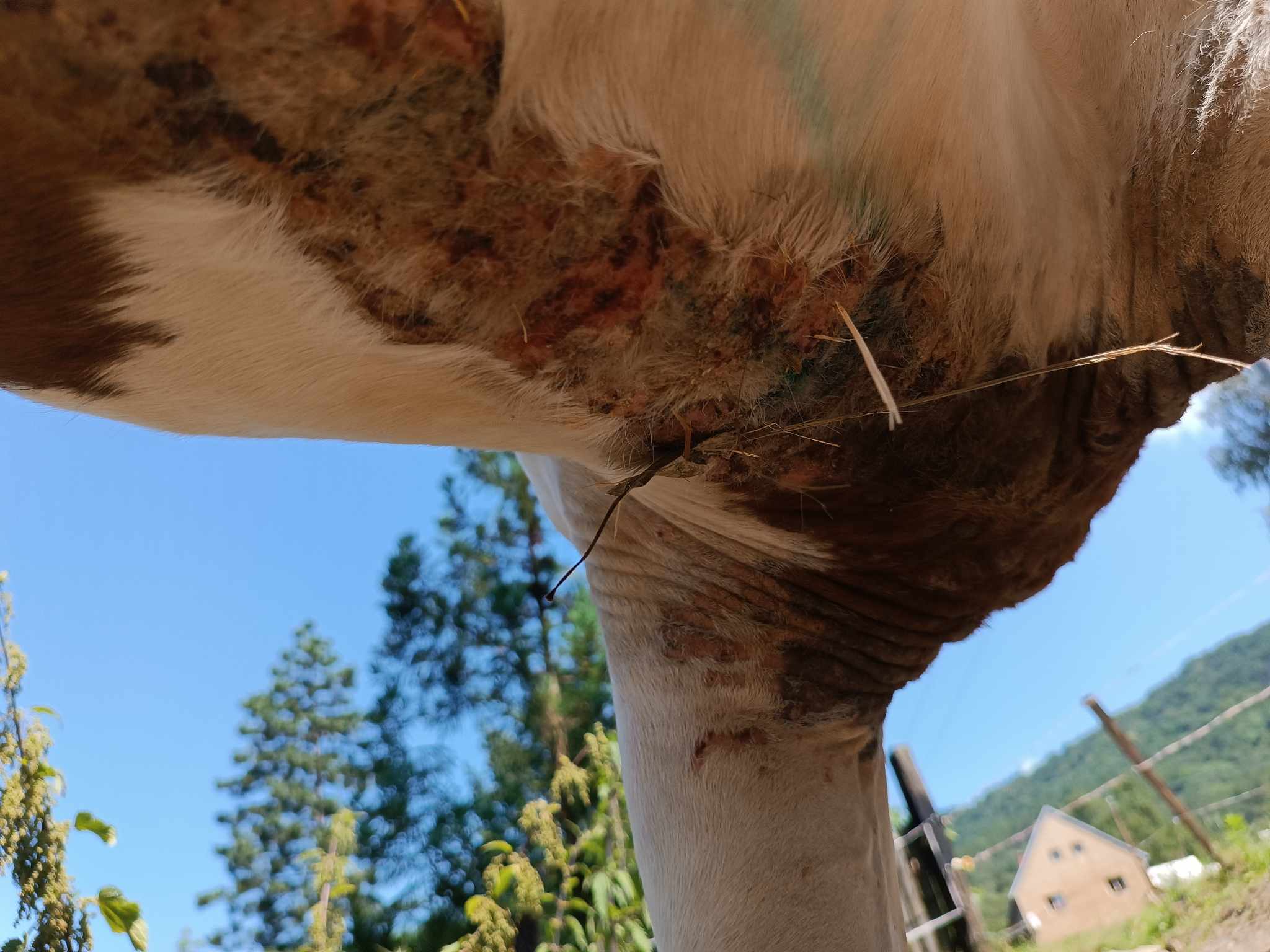 Kůň si vykusuje srst, zřejmě ho to hodně svědí. Hlavně břicho, ocas a zadek. Má strupy, rády bychom ho vyléčily, naštěstí už si nevykusuje až do masa.