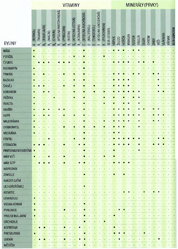 Tabulka vitamínů a stopových prvků (minerálů) obsažených v bylinách