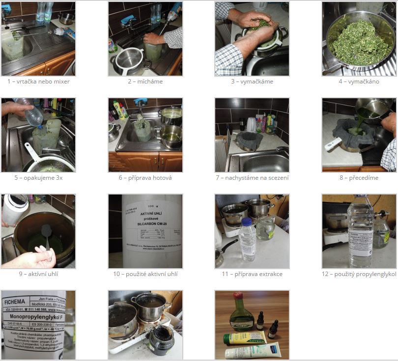 2 – Přelijte ji rozpouštědlem, které si zvolíte. Lze jich použít celou řadu. Rád používám čistý lékařský benzín, ten ale stojí 500 dolarů za dvousetlitrový sud. Stejně tak lze použít i 99 % izopropylalkohol (nebo 96 % alkohol, pozn. překl.). Alkohol absorbuje více rostlinného chlorofylu něž lékařský benzín. Výtažky připravené pomocí alkoholu jsou tmavější, sílu výtažku to ale nijak neovlivňuje. Výtažky připravené pomocí éteru, lékařského benzínu, butanu a mnoha dalších ředidel mají jantarovou a čirou barvu. Čiré výtažky samozřejmě vypadají lépe, tmavé výtažky ale mohou být naprosto stejně účinné. Při zachování správného výrobního postupu ve výtažku nezůstávají téměř žádná nebo žádná rezidua (cizí látky). Výtažky připravené pomocí rozdílných rozpouštědel užívám už osm let a nepozoruji žádné škodlivé následky. Na to, abyste z půl kila sušeného konopí (suroviny) dostali THC, budete potřebovat přibližně pět litrů rozpouštědla. Na přípravu výtažku z jedné unce (31 gramů) budete potřebovat maximálně půl litru rozpouštědla.