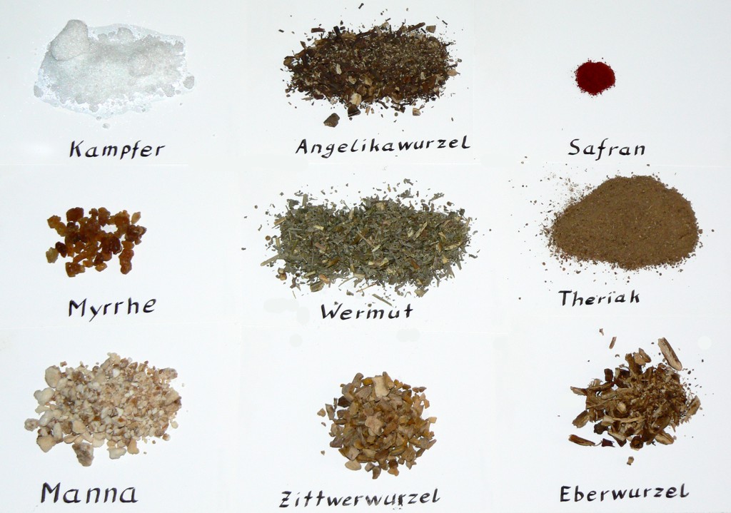 Bylinky do švédských kapek (složení švédských kapek): 10 g aloe*), 5 g myrhy (Gummiresina myrrha), 0,2 g šafránu, 10 g listu senný (Foliům sennae), 10 g kafru (Camphora naturalis) **), 10 g kořene reveně (Radix rhei), 10 g oddenku zedorie (Rhizoma zedoriae), 10 g many, 10 g theriaku (Theriak venezian) ***), 5 g kořene pupavy (Radix carlinae), 10 g kořene anděliky (Radix angelicae). Recept na výrobu švédských kapek od již zesnulé rakouské bylinkářky Maria Treben: