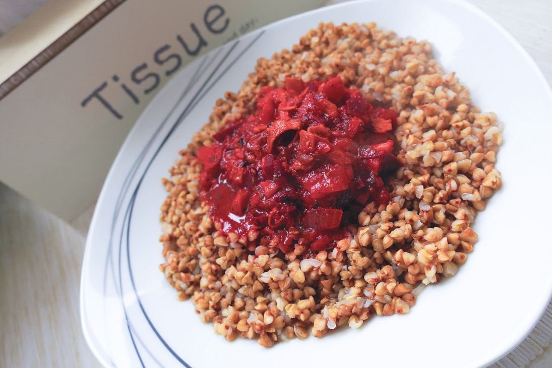 Po 10 minutách dát z plotny a naservírovat pohanku a doprostřed do důlku dát hlívovo-řepovou směs.